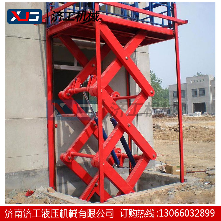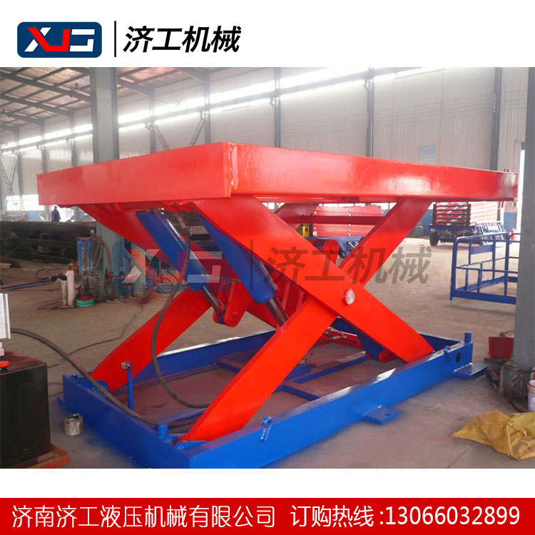 固定剪叉式升降機貨梯主要用于建筑物層間貨物上下運送,安裝在地坑內,下降低時工作臺面與地面相平。