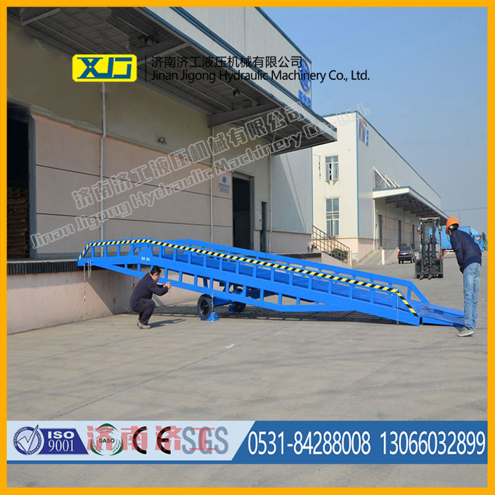 1. 用于貨物裝卸位置不固定場合的用貨物裝卸輔助設備,是實現貨物快速裝卸的專用物流機械,通過它使叉車等搬運車直接進入貨車、列車車廂裝卸貨物,在提高工效的同時又能充分保障作業安全。 2. 移動式登車橋的頭部設計有兩個互成90°的登車跳板,這種設計可以使用戶能夠合理地利用場地作業,減少作業場地,具有很好的場地適應性。 3. 采用前腿支撐方式,穩定性好; 4. 高度調節范圍大,適合各種工況; 5. 坡度低,配有安全鏈條和標示,安全性好; 6. 臺面均設計為網格狀鋼板,這種結構能證具有很好的強度,又具有防滑功能,還能方便地清掃工作臺面,使它能經常地保持清潔、美觀。 7. 無須外接電源,通過手搖泵作動力能輕松地在其整個調整范圍內按50mm的倍數進行高度的調整。可以充分適應各種不同高度的貨車。 8. 需要移動時,可利用叉車作牽引,配用隨機配備的快夾即可方便地進行移動,從而實現貨物的快速裝卸。 | |